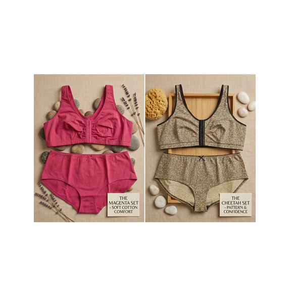 Our front-closure bras are designed for incredible comfort and accessible support, paired with matching cotton-soft panties. It's the perfect combination of function and elegance.